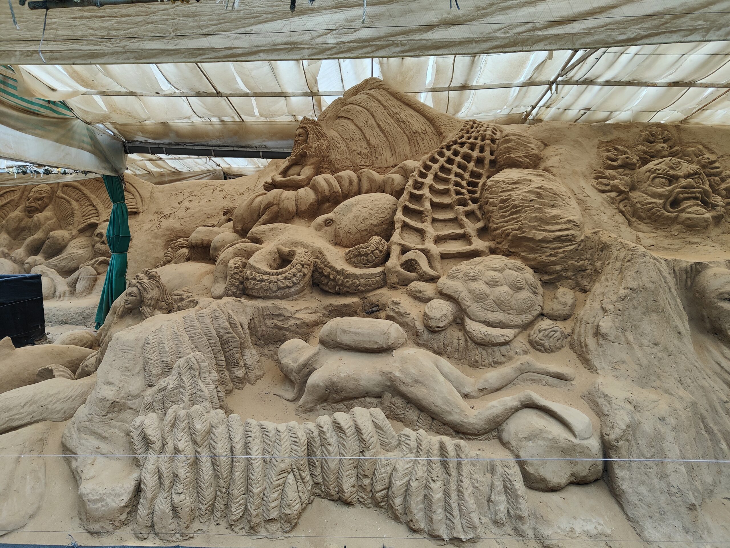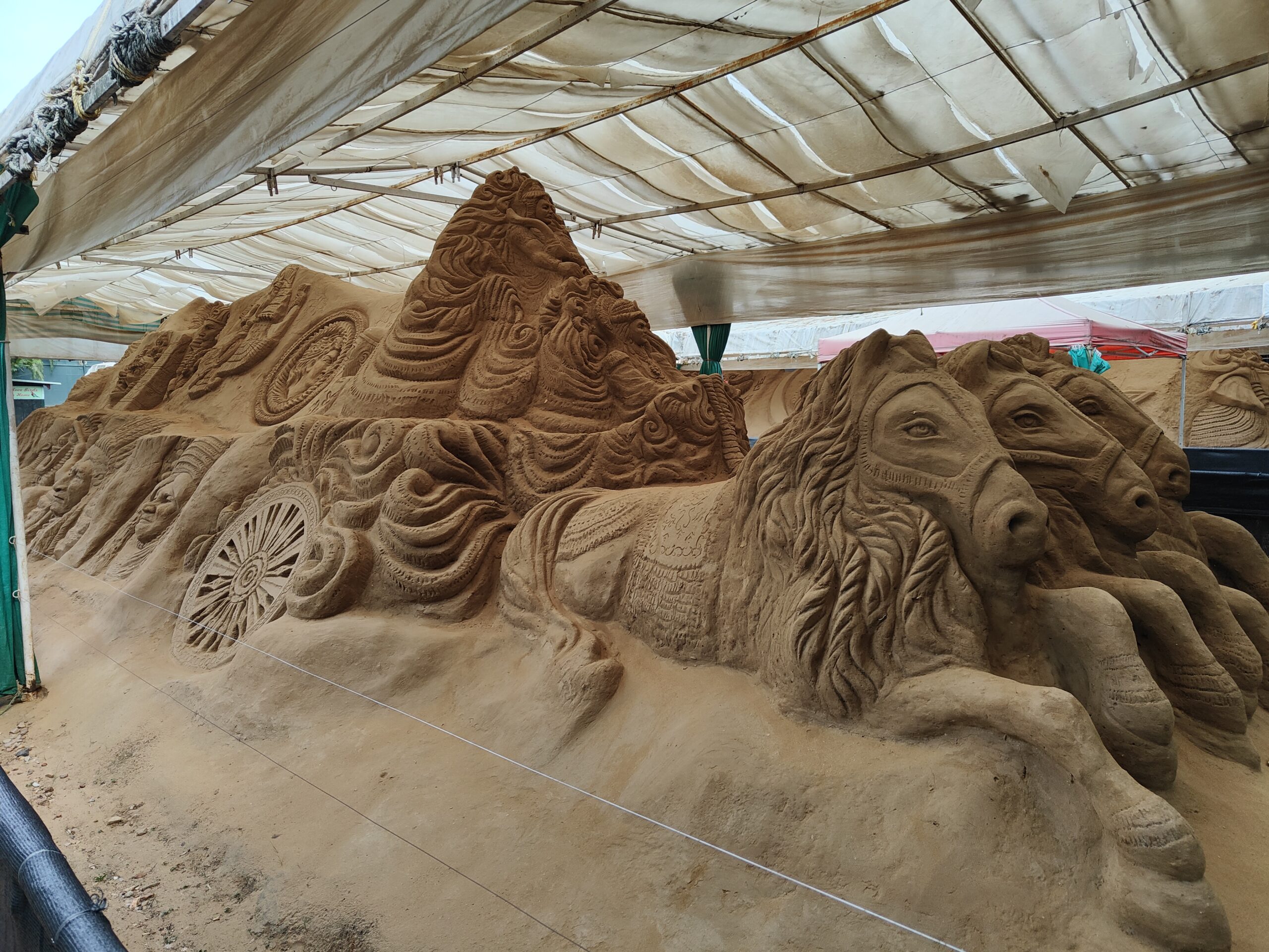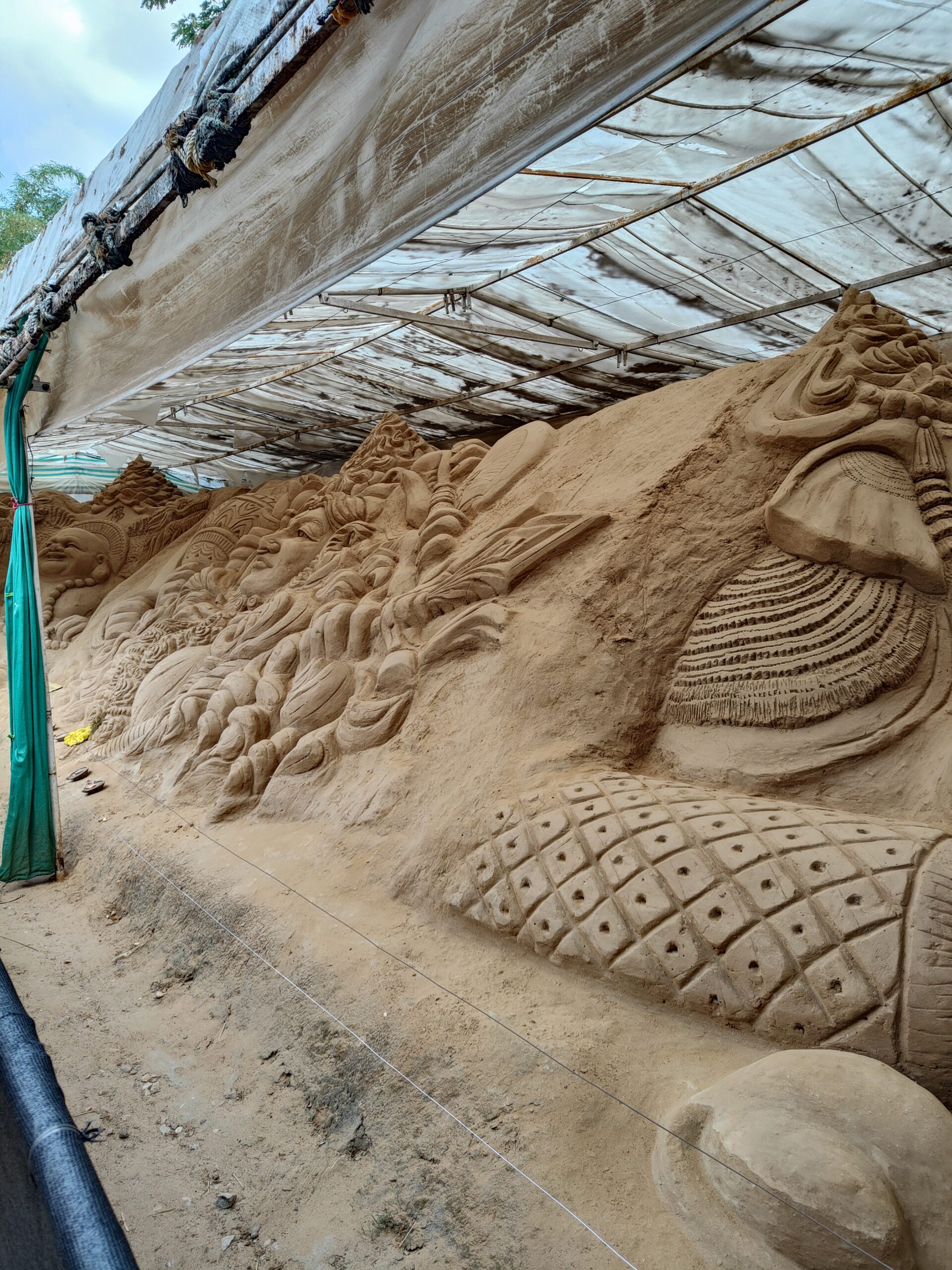 The sand structures are protected inside metal closings, and a waterproof yet translucent sheet covers the roof. This protects them from rain and direct sunlight. As these delicate structures are made with sand, water and some glue, they are easily damaged. Hence they are brushed weekly and reconstructed in case of damage. Pests such as insects, rodents, and snakes pose a significant threat, so appropriate insecticides and pesticides are applied to the statues.