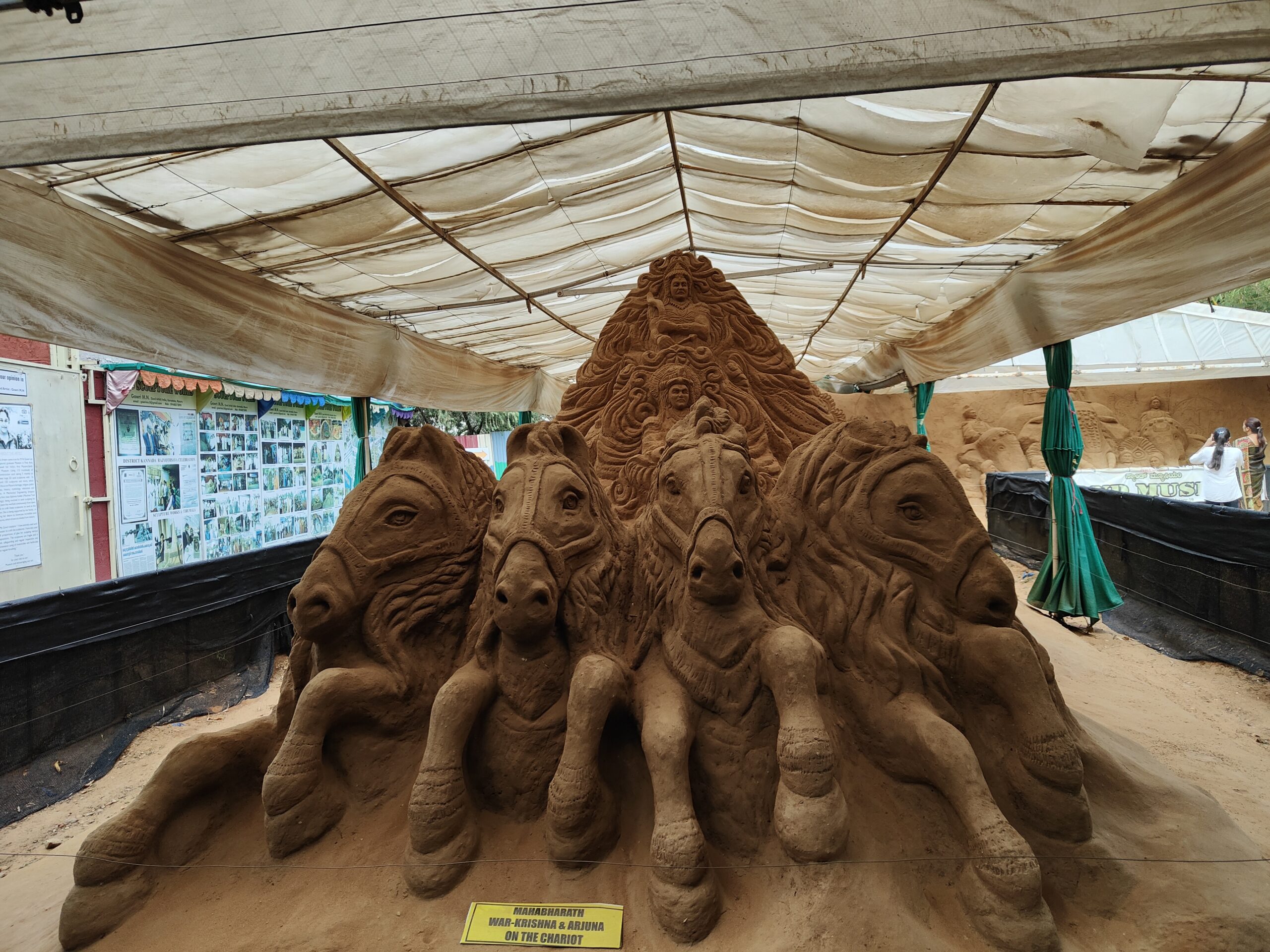 At the entrance, visitors will be welcomed by a 15 ft tall carving of Lord Ganesha adorned with sculpted ornaments. The museum also has depictions of scenes from the epics such as Mahabharata. Among these, the most remarkable exhibit represents the Kurukshetra war, where Krishna is seen riding the chariot with Arjuna seated behind him. Some statues exhibit the cultural heritage of Mysore, such as the sculpture of the Mysore King Narasimha Raja Wodeyar sitting on a grand throne during the Dasara festival. These exhibits make it an important tourist destination in Mysore.